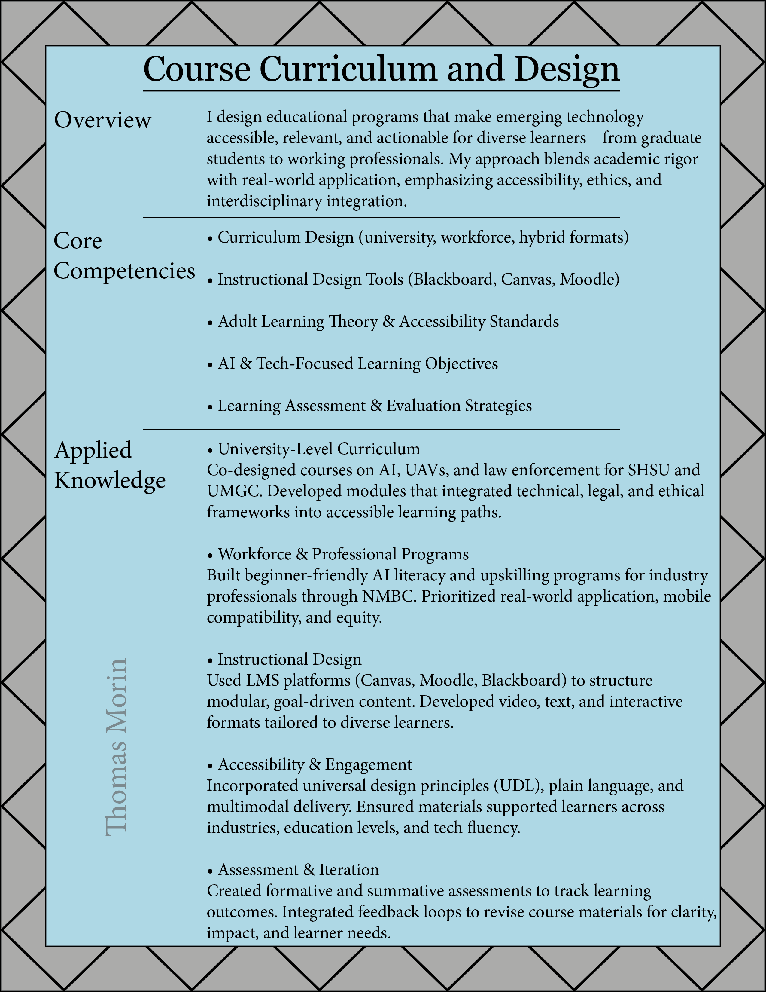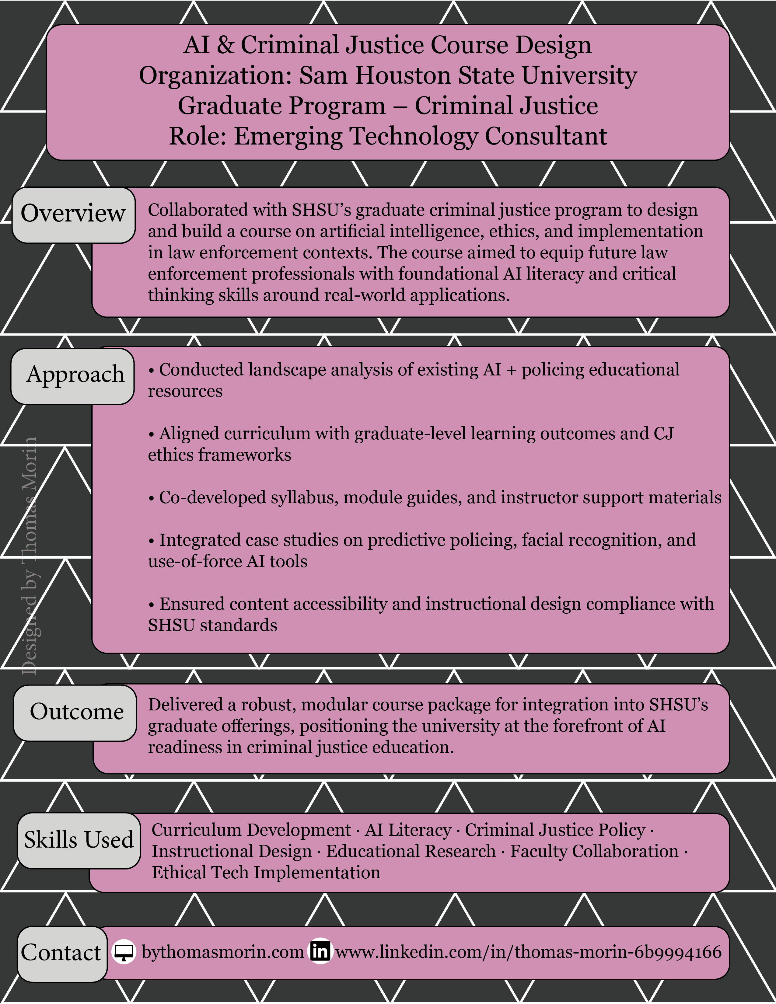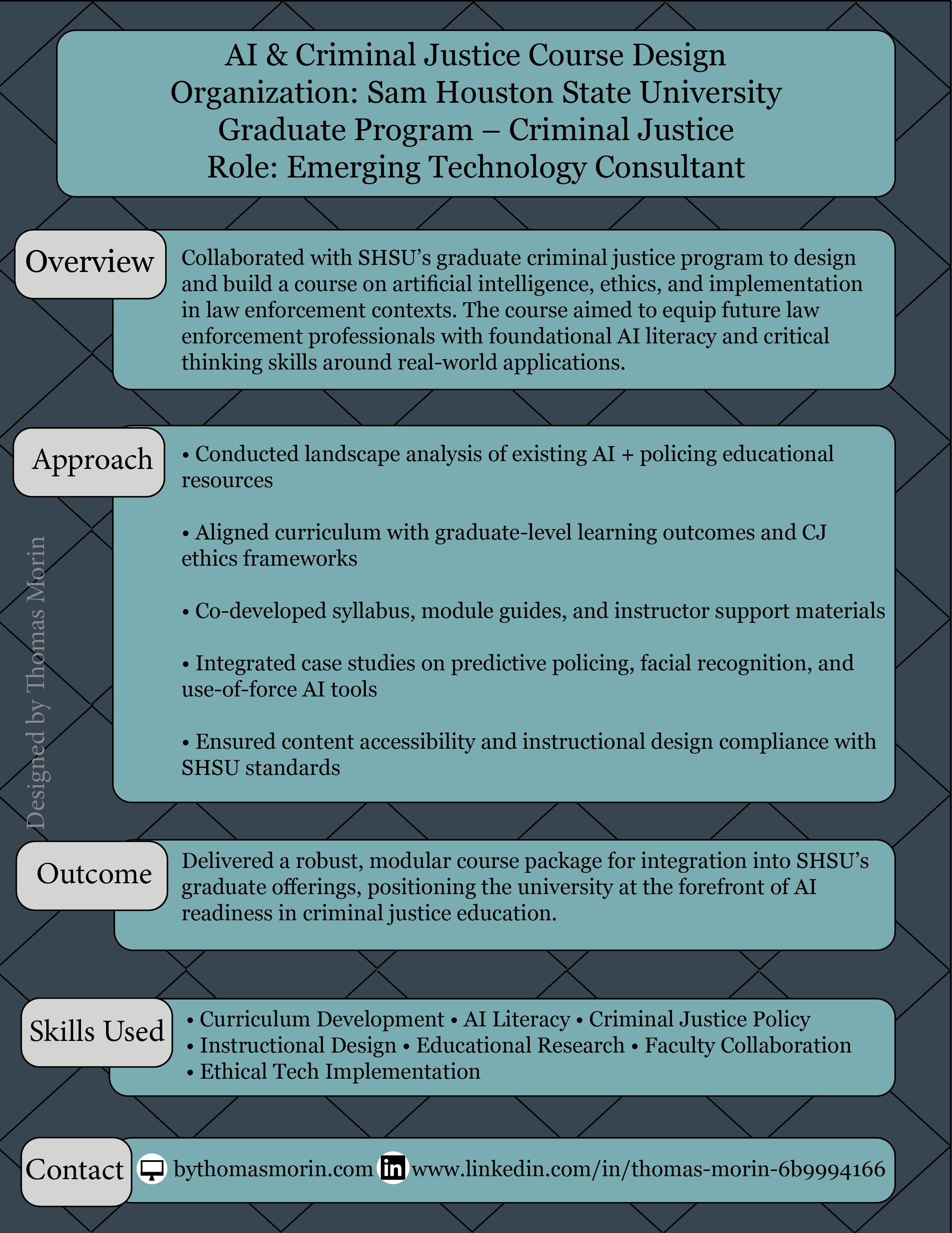 Designed and developed a graduate-level course on AI and law enforcement for Sam Houston State University's criminal justice program.