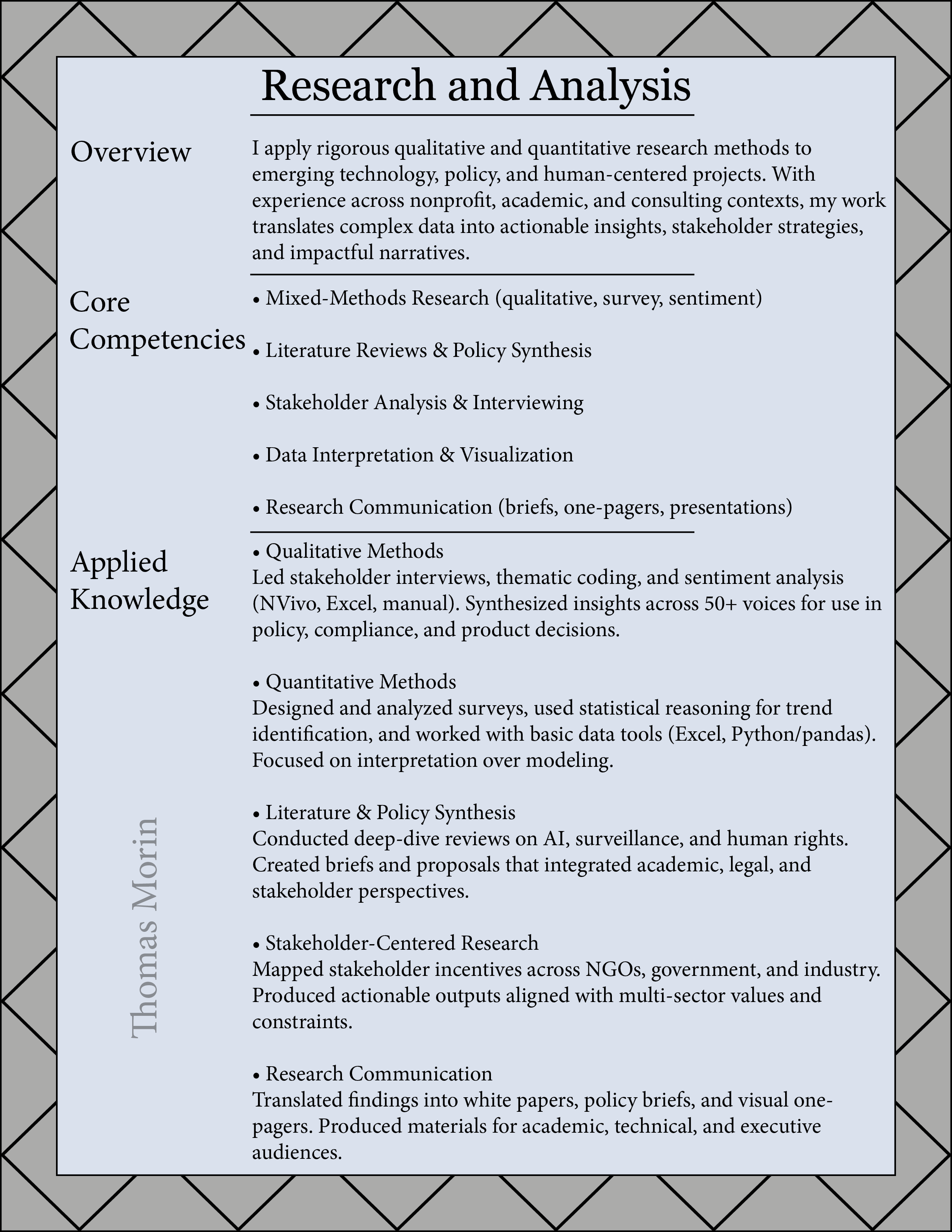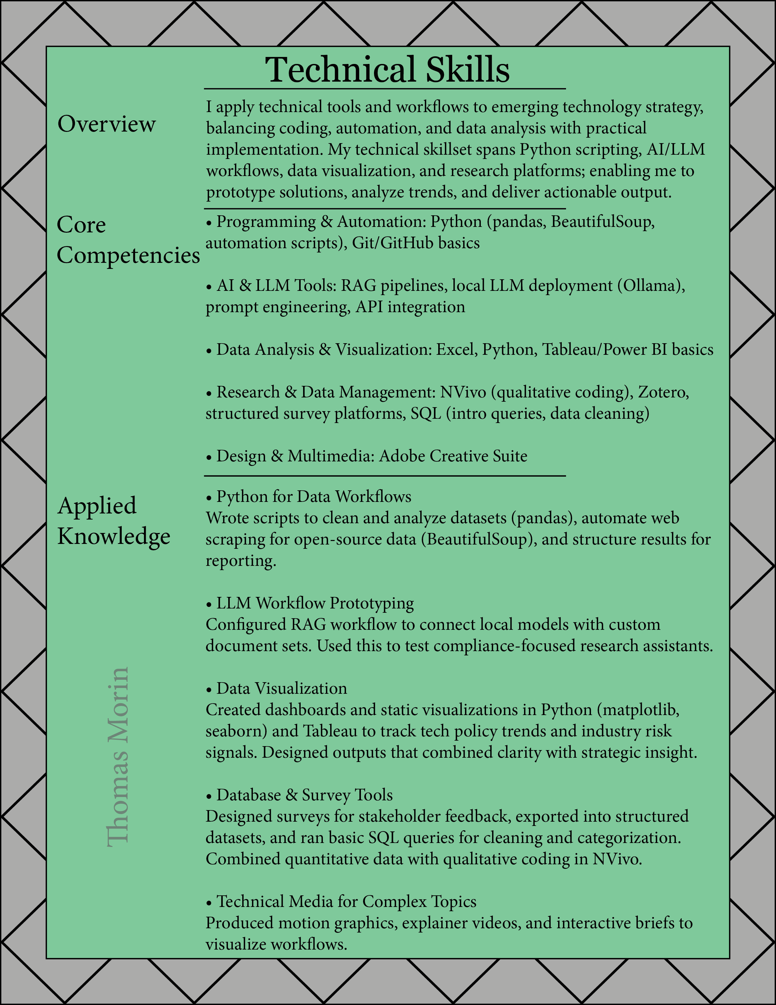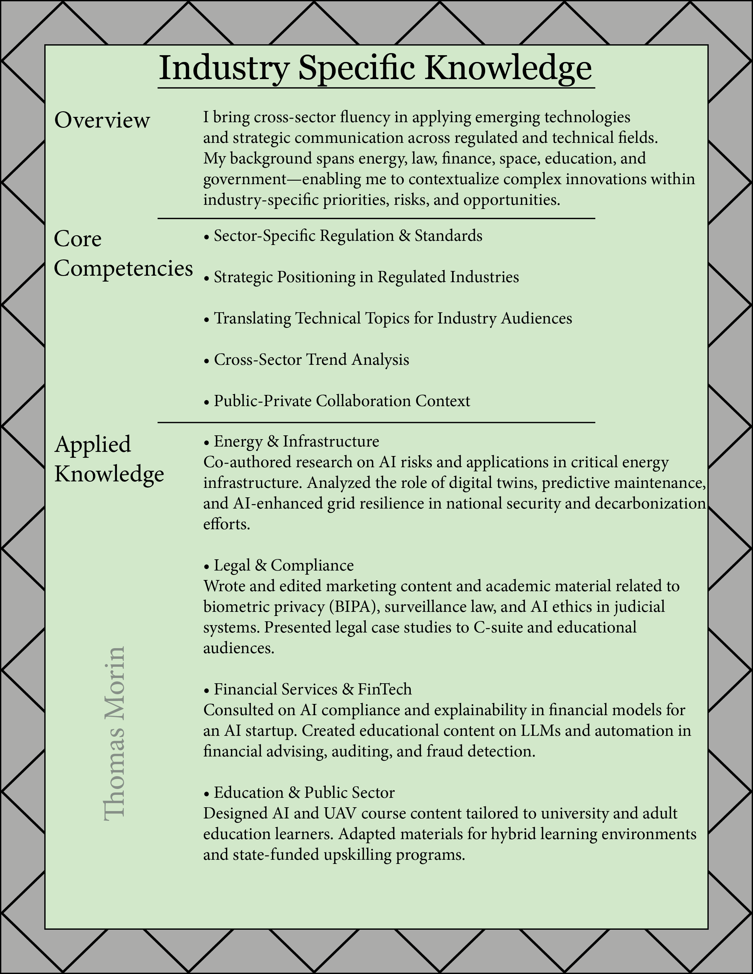 I’m an emerging technology strategist with expertise in AI, data analysis, and technical communication. My work bridges the gap between cutting-edge tools and real-world implementation, helping organizations design AI strategies, build educational programs, and communicate complex systems with clarity.I’ve designed AI certificate programs, developed graduate-level courses at SHSU, and published research on IP theft and energy infrastructure. On the technical side, I work with Python, RAG workflows, and research tools like NVivo to analyze data, automate processes, and synthesize insights. I also apply design and multimedia tools — from Adobe Creative Suite to data visualization platforms — to make technical outputs actionable for executives, policymakers, and the public.Whether I’m developing a curriculum, leading a research initiative, or building a startup’s AI strategy, I focus on making emerging technology not just innovative, but practical, ethical, and people-centered.