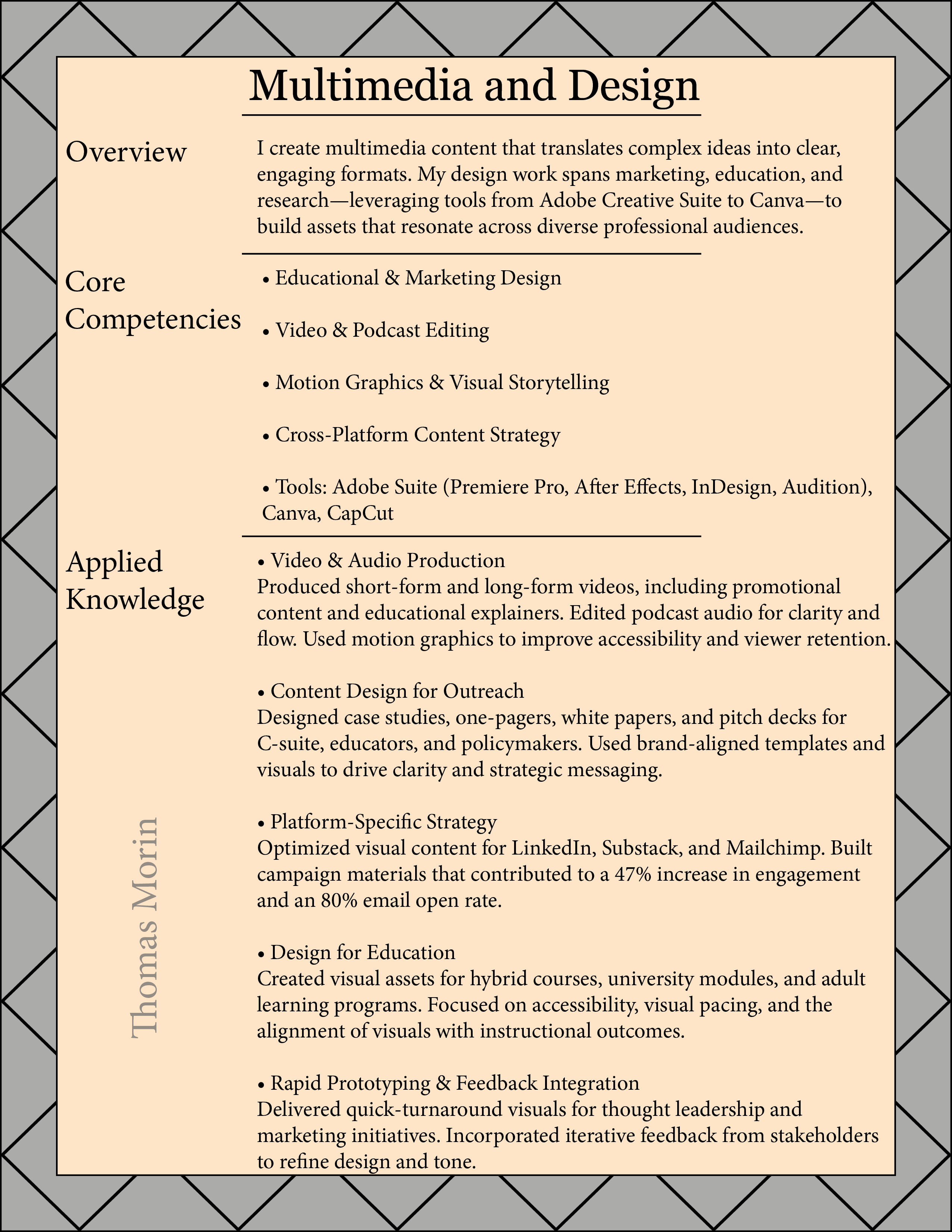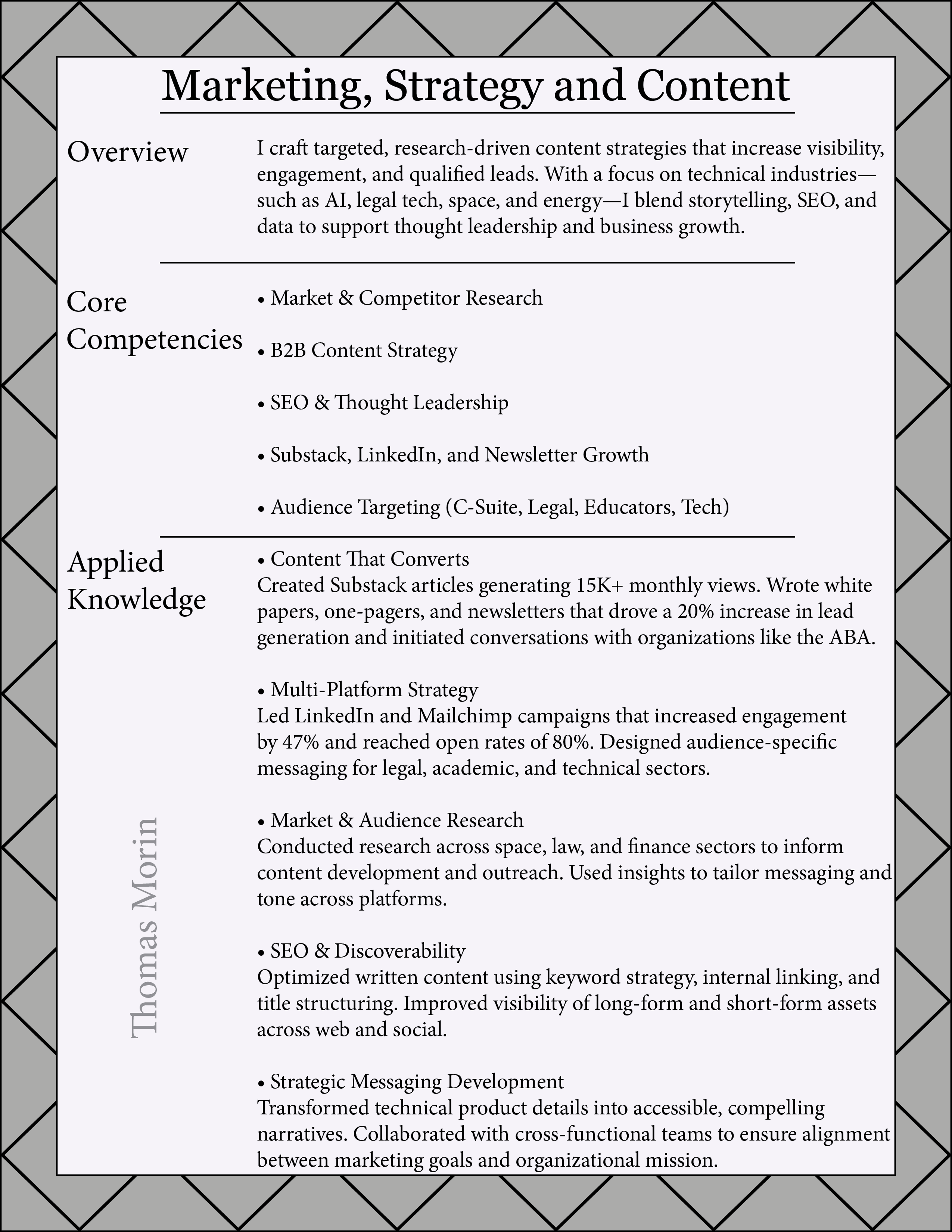 "He’s helped shape not only my brand but also how my team approaches research and problem-solving. Always creative, analytical, and forward-thinking - he’s exactly who you want in a consultant, manager, or strategic advisor. A true asset to any team. We will most definitely work with him again in the future."
