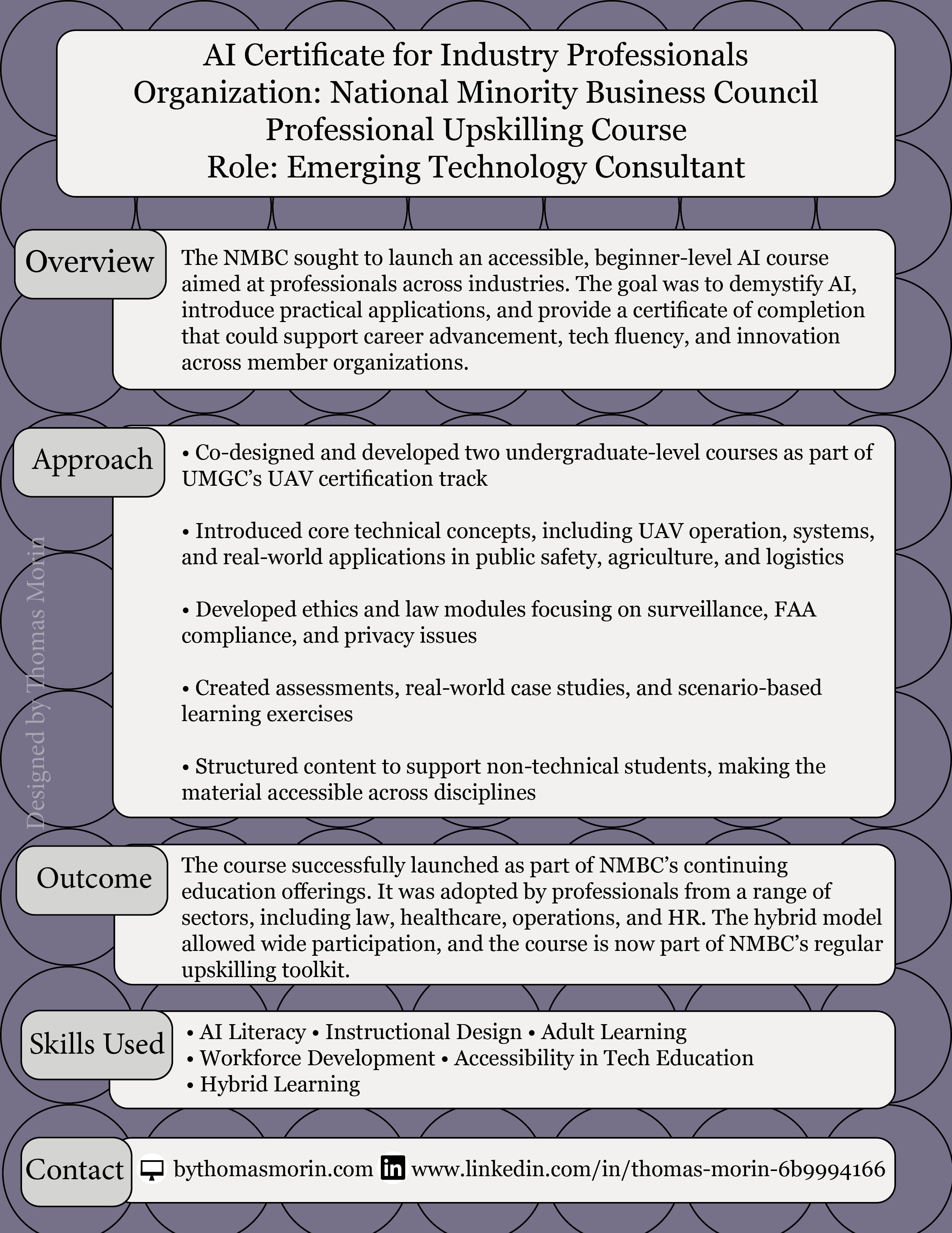 Collaborated with the National Minority Business Council to design an AI certificate program tailored for upskilling professionals across industries.